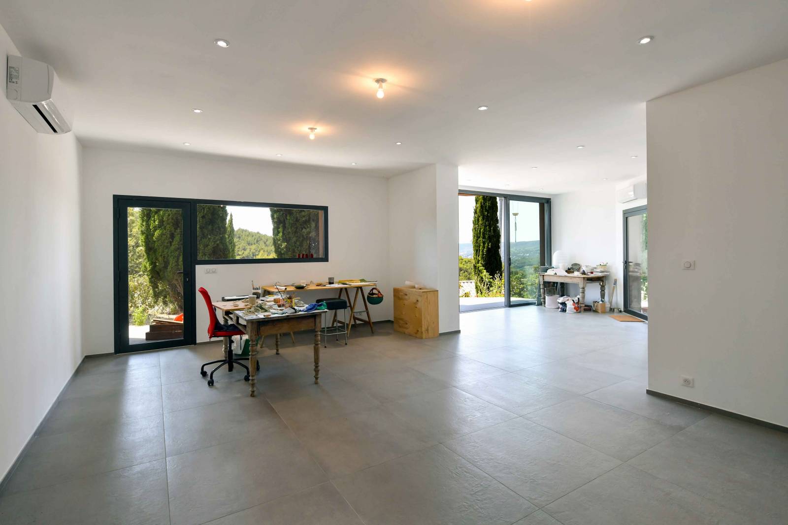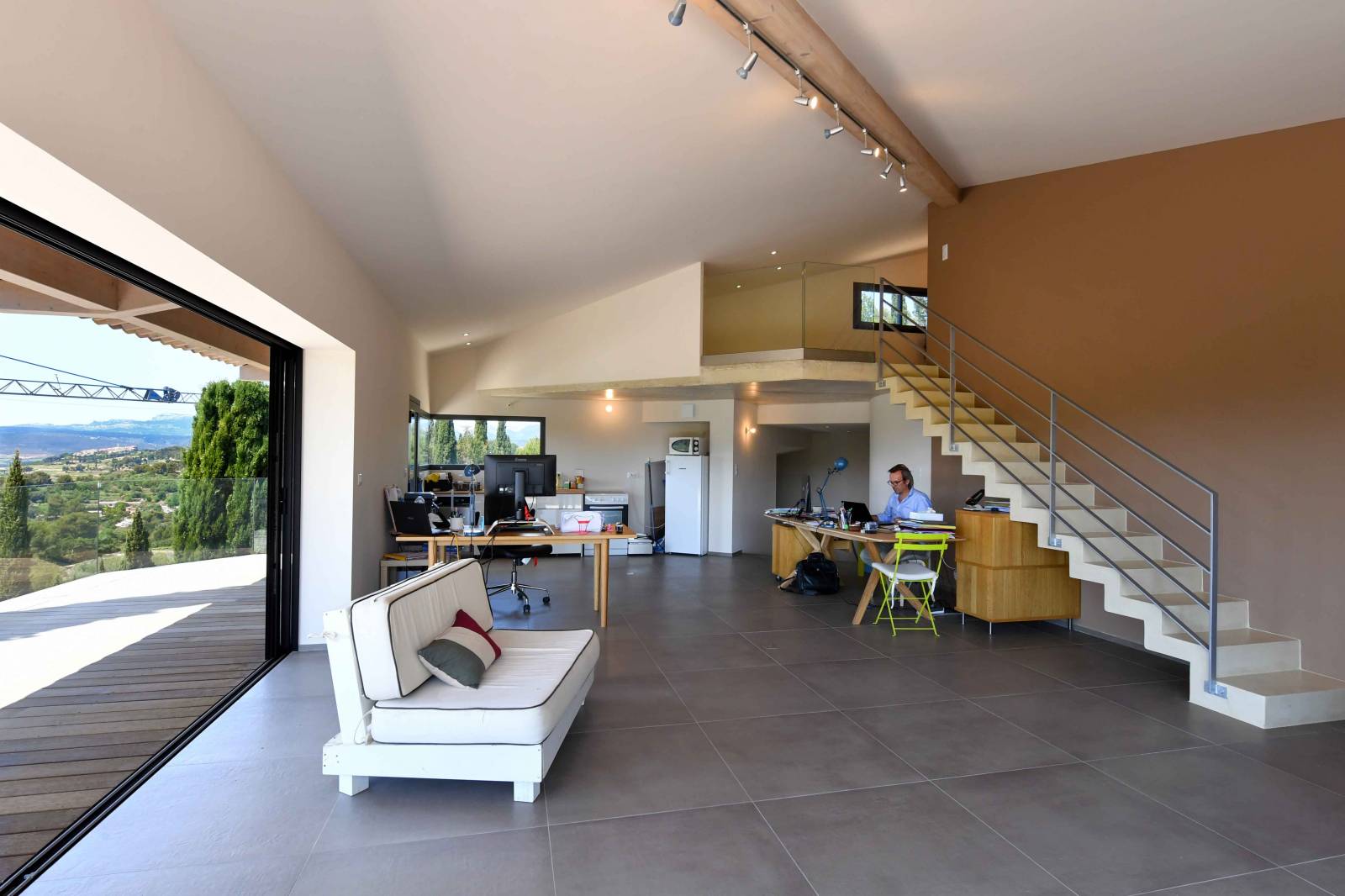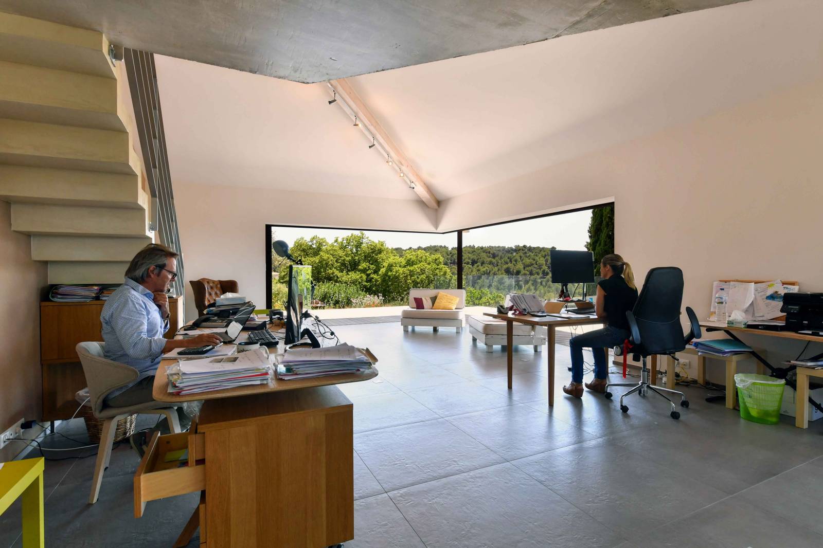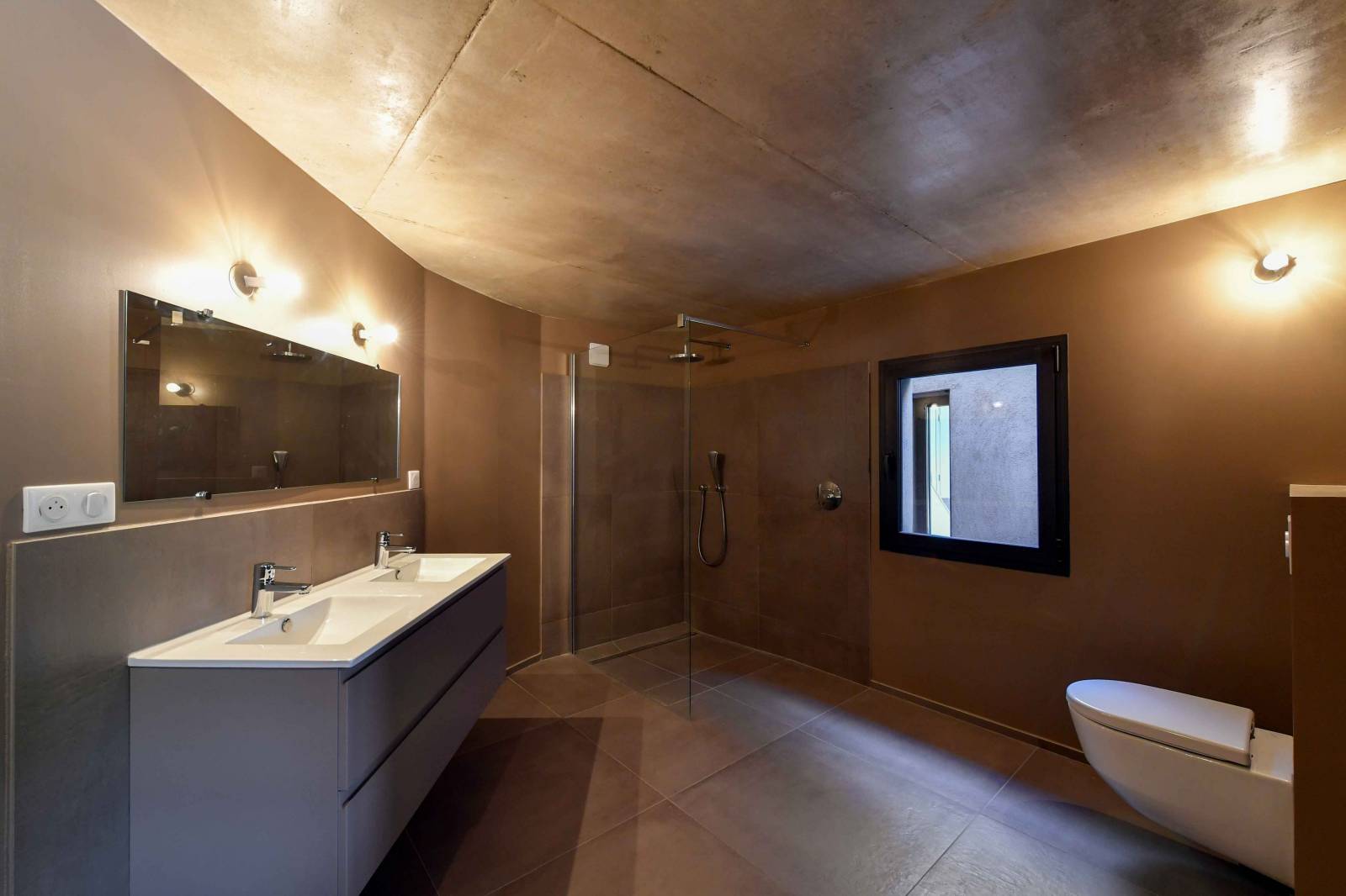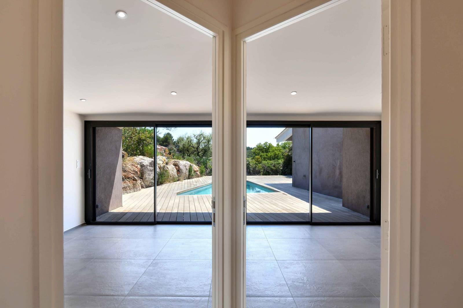 Ce projet se situe au coeur des vignes, dans le sud de la France. Composé de deux niveaux, l’entrée se fait par la partie basse de la maison. Les vues cadrées sur les espaces extérieurs forment le chemin autour d’un escalier qui mène à l’espace de vie. Spacieux et totalement ouvert sur une belle terrasse en IPE, bois exotique. Les gardes corps en verre donnent de la profondeur, ils disparaissent dans le paysage et offrent une vue incroyable sur cette nature de Provence. Les chambres du haut donnent sur l’espace piscine, un espace intime et arboré. Les matériaux utilisés sont dans un style contemporain : béton ciré pour les salles de bain, grands carreaux gris pour le sol, béton brut et bois exotique.