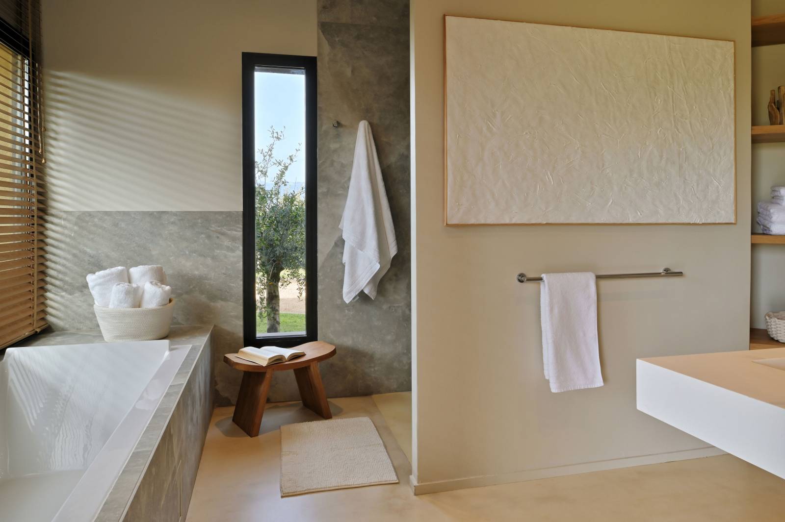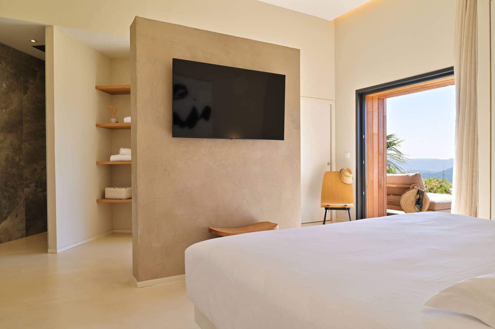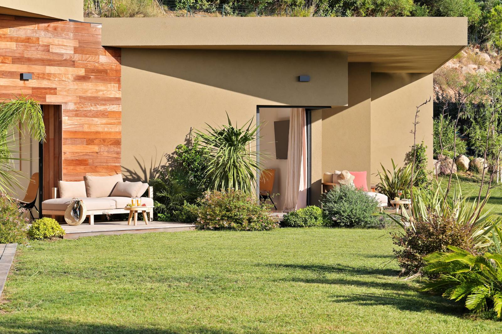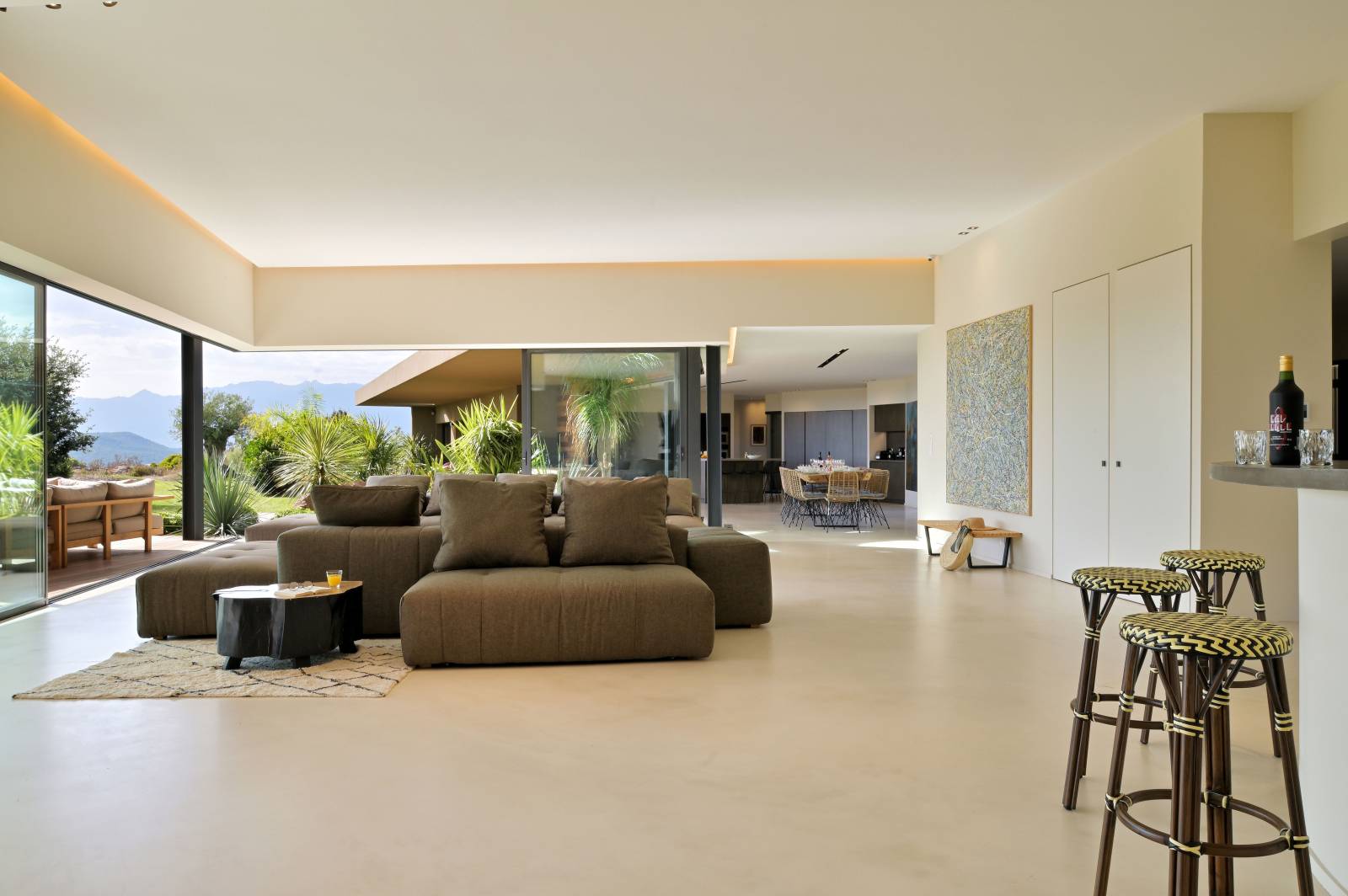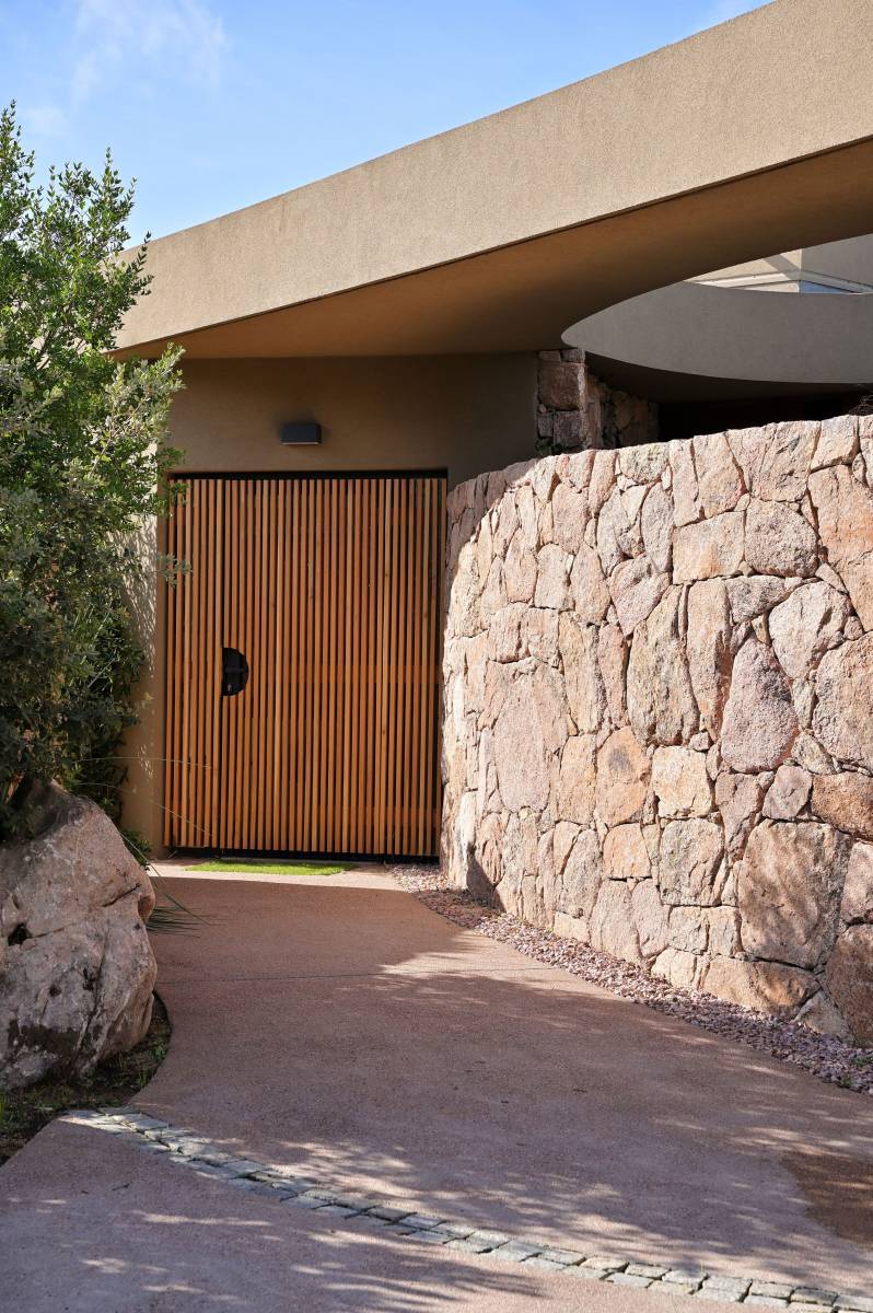 Situé sur un site exceptionnel, sur les hauteurs de Porto-Vecchio, au cœur du maquis corse, ce terrain de 5 000 m2 domine la baie de Palombaggia. L’intégration de la maison et le respect du site étaient un point très important dans la demande de nos clients. Dans un style méditerranéen et contemporain, cette construction s’insère avec humilité entre les rochers de granit rose et le maquis corse. Cette villa se découvre le long du parcours où successivement patios intérieurs, espaces clos et vues lointaines, sont soigneusement mises en scène. L’ espace de vie s’organise autour d’un espace cheminée en contre bas, avec vue sur un jardin intérieur. Chacune des 6 chambres dispose de sa propre salle de bain et d’une terrasse privative. Ces espaces intimes sont entourés par la végétation soigneusement choisie : bambou, pitosporome, fougère. Dans cette construction vue mer , il n’y a pas de limite entre l’intérieur et l’éxterieur. La façade entièrement vitrée s’ouvre dans sa totalité sur une terrasse réalisée en bois exotique. Les avancées de toits plats protègent du soleil et permettent de profiter de tous les espaces. Vue du ciel, on peut voir ce toit plat, géométrique et végétalisé. L’espace piscine se trouve en contre bas de la villa. Il faut suivre le chemin créé entre Laurier et Romarin. Pour arriver dans ce havre de détente où il n’y a pas de limite entre le bassin de la piscine et la mer. Chaque détail et matériaux, ont été dessinés et choisis pour répondre aux envies de nos clients.