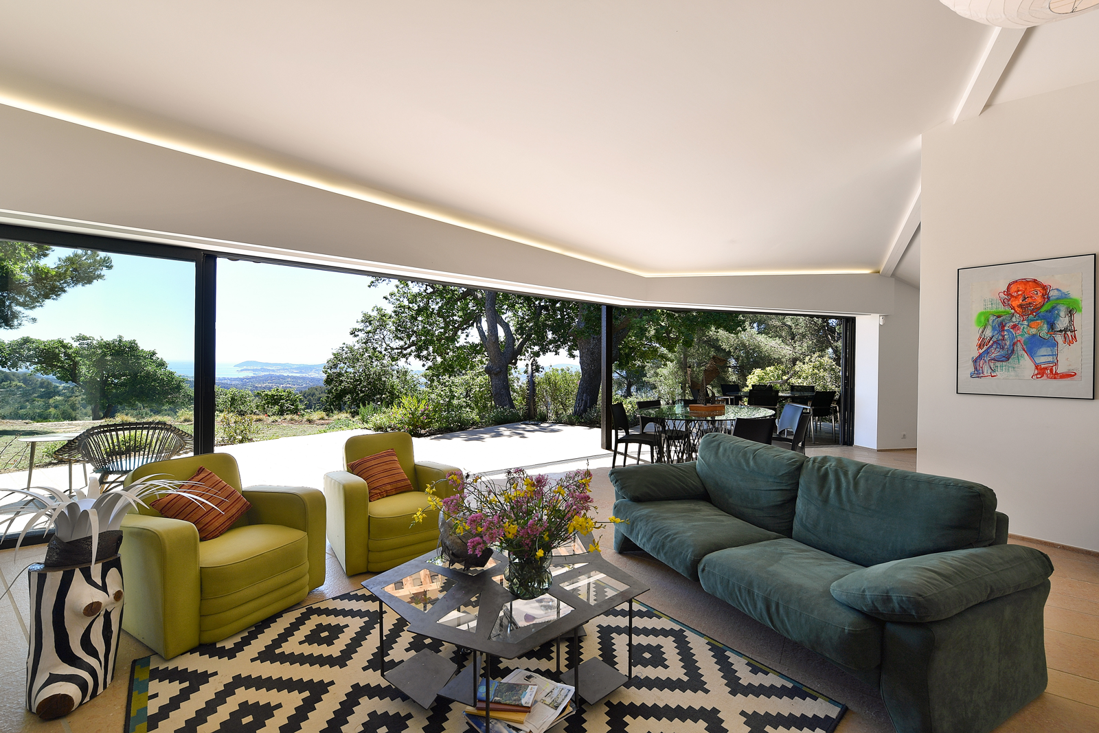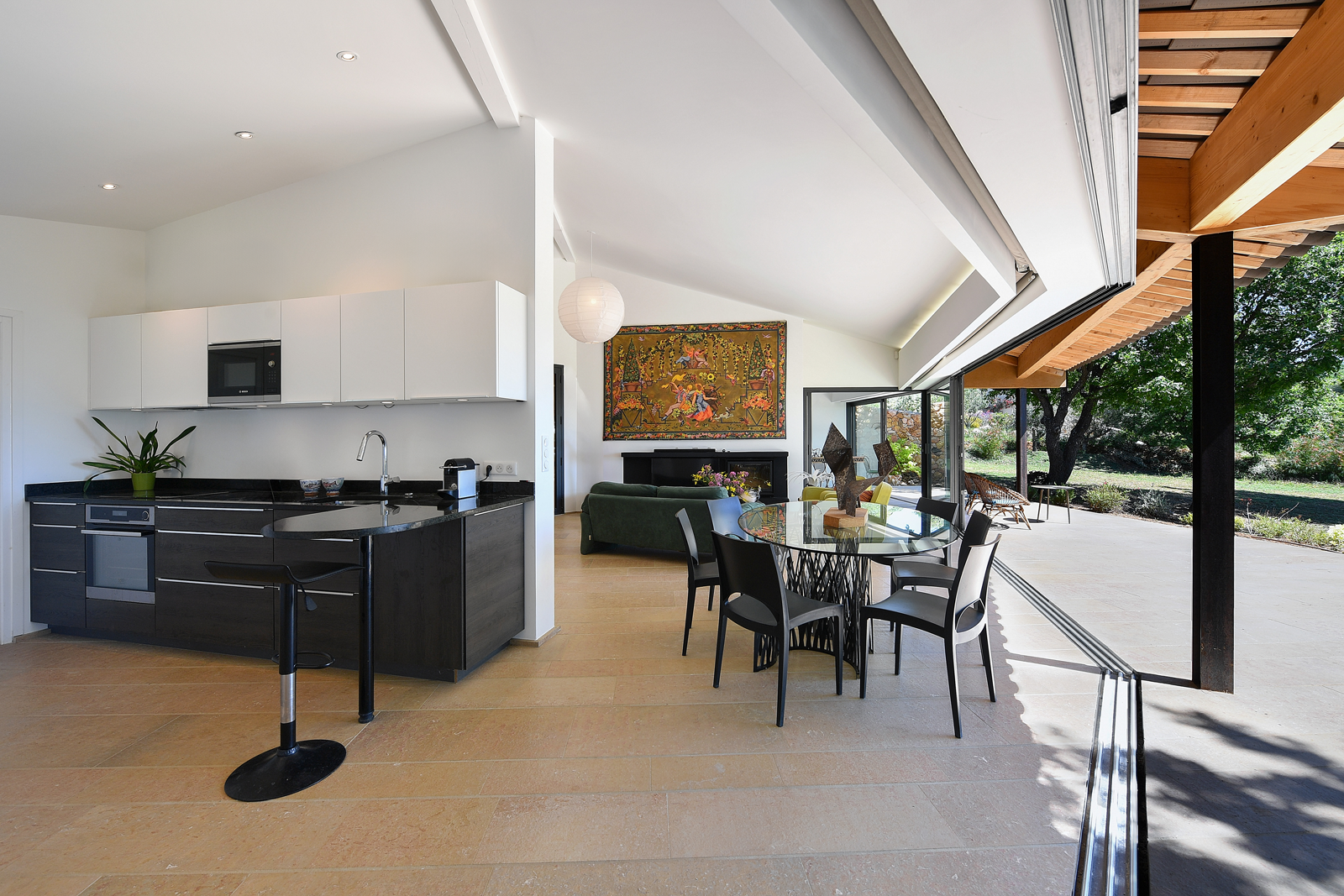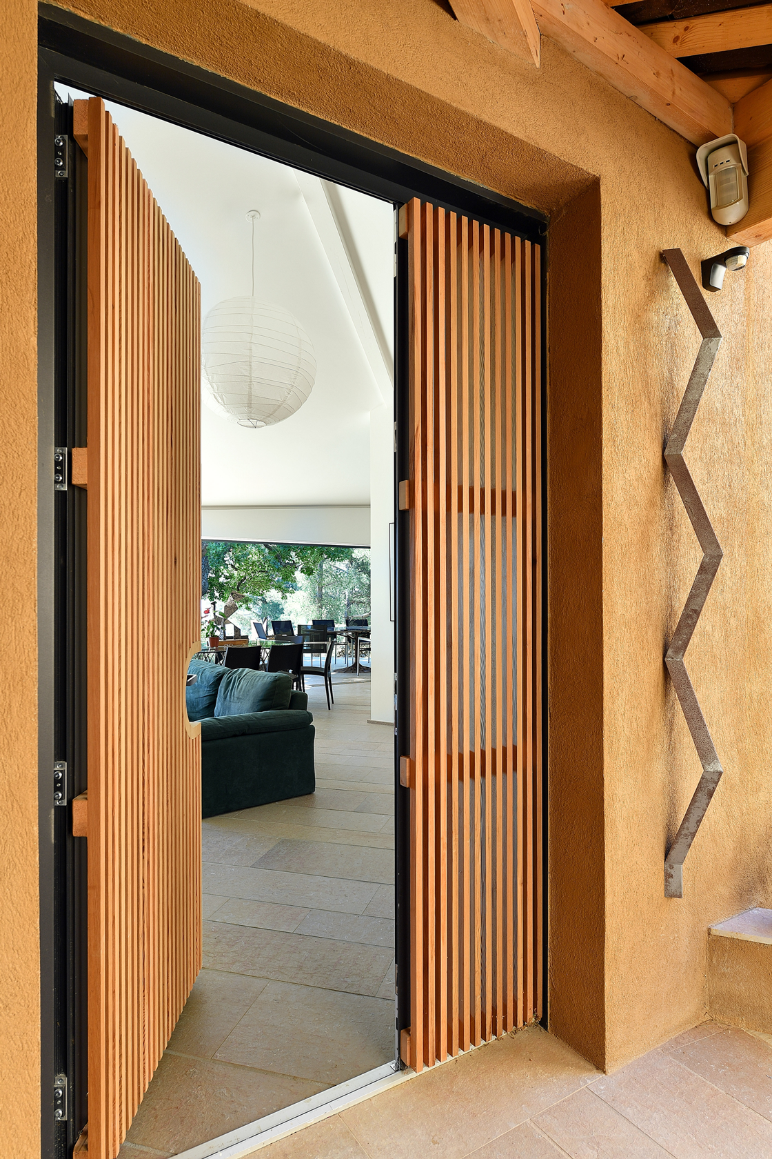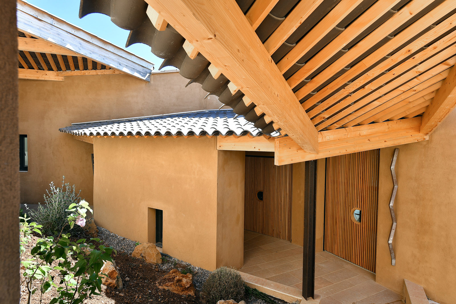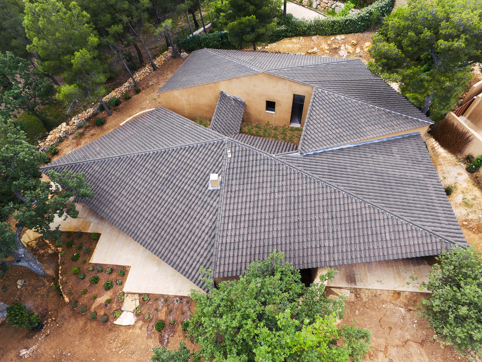 Cette construction s'organise autour de jardins. Un chemin extérieur en pierre de Cénia dessert un premier espace, avec chambre et salle de bain. La descente se poursuit jusqu’à la porte d’entrée principale. Il faut suivre le cheminement pour découvrir l’espace de vie qui s’ouvre totalement sur l’extérieur. Aucune limite entre le salon, la terrasse et l’espace jardin. Face à la porte d’entrée, il faut emprunter un petit escalier pour accéder à un autre espace indépendant avec chambre, salle de bain et terrasse qui donne sur un jardin.